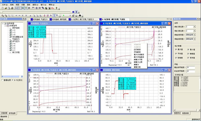 | ● 显示方式灵活:时域曲线显示,可同时显示多个窗口,每个窗口可显示8个测点数据。X-Y记录仪方式绘制滞回曲线。 ● 视图实时增加数据和减小数据量,方便用户实时观测,同时提供单双光标读数据功能,并实时计算最大值、最小值等统计值。 ● 数据快速定位功能,对于长时间监测的工程,数据量很大,通过快速定位功能,可以很方便的找到需要的数据。 ● 数据标记,用户可以对感兴趣的数据加上标记,这样可以在各块数据间进行灵活定位,节省操作时间。 ● 导入导出平衡结果,方便用户继续测试。 ● 可根据用户要求,将数据导入EXCEL 、TXT文件。 ● 右键直接读取阀门的各项参数。 ● 通道参数设置,可对每个通道进行单独设置。 ●一键式生成测试报告。 |