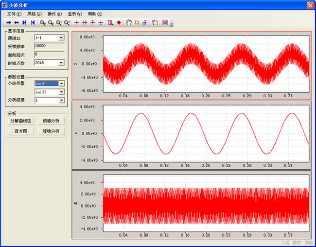 小波变换将信号与一个时域和频域均具有局部化性质的平移伸缩小波基函数进行卷积,将信号分解成位于不同频带时段上的各个成分。它在检测信号的奇异点时具有傅里叶变换无法比拟的优越性,利用小波分析可以精确地检测出信号的突变点。即高频特征的正弦信号的加入点,这是因为间断点包含了高频信息。因而,在信号处理中,小波分析的应用十分广泛,如奇异信号检测、信噪分离和频带分析等。本模块包含小波分析、小波重构、小波去噪等功能。 |