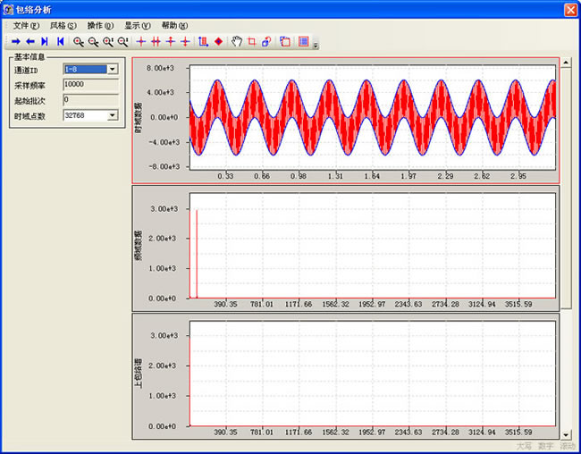 包络分析技术是对低频冲击所激起的高频共振波形进行包络检波和低通滤波即解调,获得一个对应于低频冲击,而又放大并展宽了的解调波。该模块提供原始信号、上包络、下包络以及它们频谱的对比显示。
