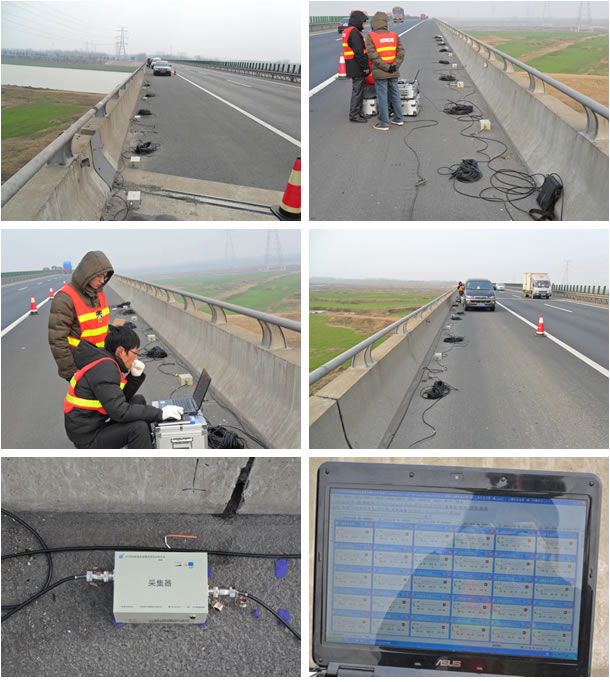 一、项目简介公司应京沪高速沭阳段设计方和施工方邀请,分别与2011年、2013年两次参与京沪高速沐阳段新沂河大桥加固前后的桥梁模态试验。两次试验分别采用有线、无线TZT5926进行试验。二、测试设备TZT5926 大型结构动态特性测试分析系统(三向,共 10 台)TZTDAS 信号测试分析软件TZTMP 模态测试分析软件笔记本电脑一台、扩展线缆若干三、实验过程此次实验共将该大桥分为 6 跨,每跨 30m 左右,每跨布置 9 个测试点,将 TZT5926 测试系统按照测点位置布置好后,即可对桥梁实时振动信号进行采集。采集完成后即可采用 TZTMP 模态分析软件对桥梁进行模态分析。四、现场照片